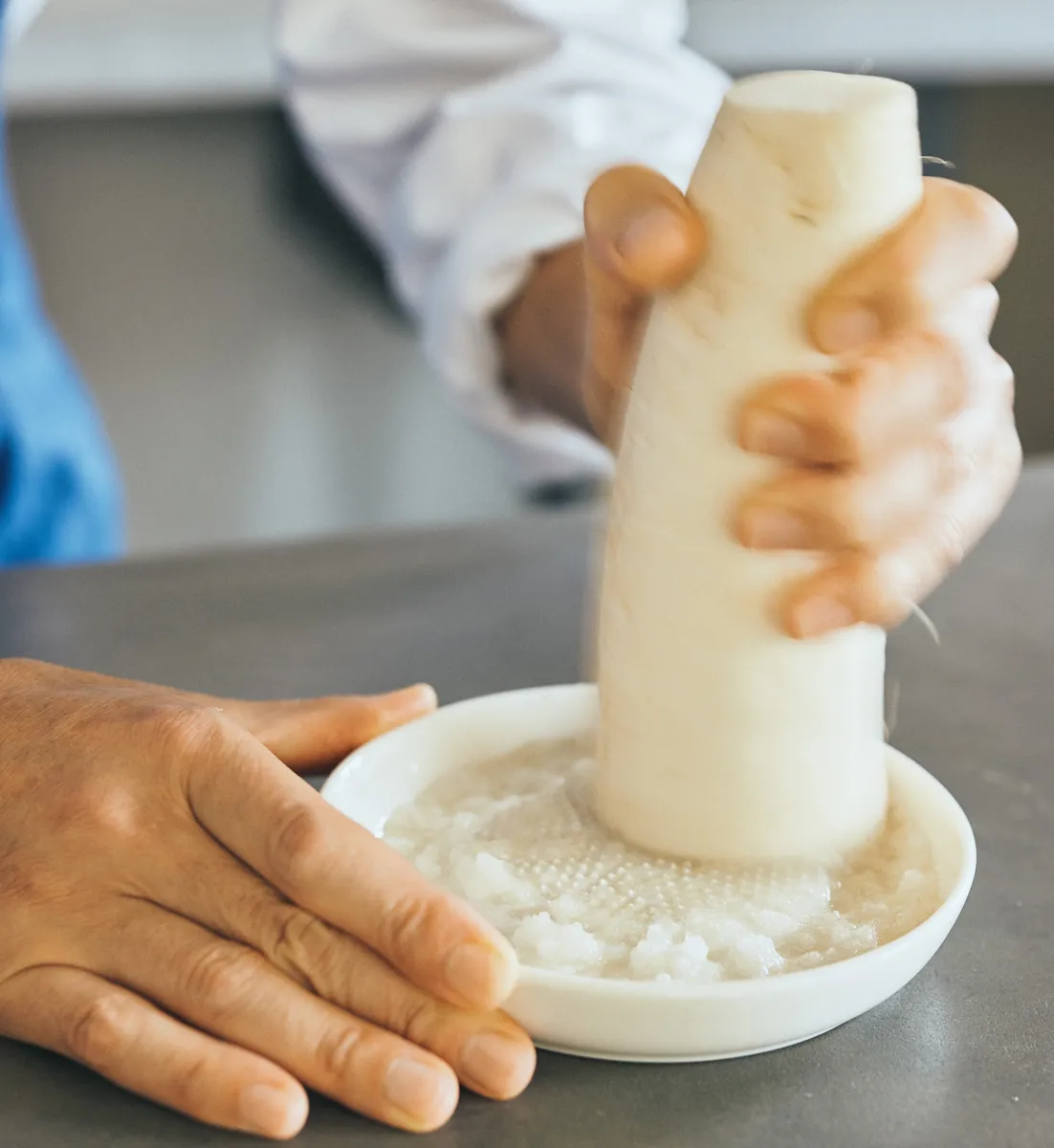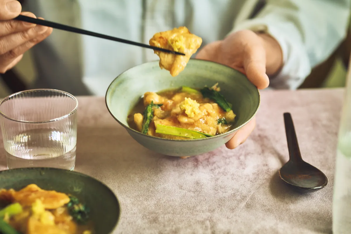 「肌はおもにたんぱく質からできています。三大栄養素のひとつであるたんぱく質を食事でしっかりとることは、美肌をつくる秘訣といえるでしょう。たんぱく質には動物性と植物性があり、動物性のほうがたんぱく質の含有量がより多いのが特徴です。たんぱく質は消化によってアミノ酸に分解・吸収されますが、動物性たんぱく質は植物性に比べて分解・吸収に時間がかかるので、消化を促す〈酵素〉を多く含む大根などといっしょに食べると、より効率的に摂取できます。また、美肌にはたんぱく質の一種であるコラーゲンも大事。体内でコラーゲンをつくり出すときに欠かせない鉄と、ビタミンCを含む小松菜などの季節の野菜をいっしょにとることで、さらに美肌につながります」