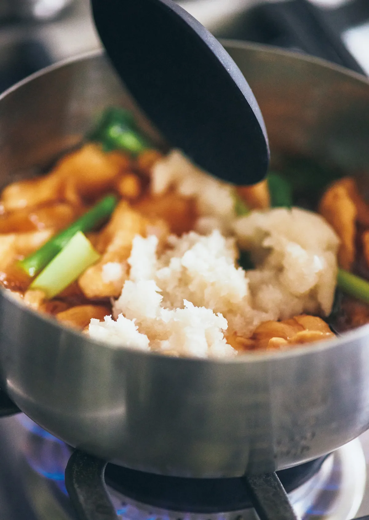 - 鍋にだし汁と、しょうゆ、みりん各大さじ2を入れ、中火にかける。煮立ったら、鶏肉を加えて3〜4分煮る。小松菜を加えてさらに1分ほど煮る。大根おろしを加えてひと煮立ちさせ、器に盛る。しょうがをのせ、削り節を散らす。