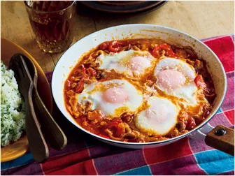 卵は夕飯のメインおかずになれる。卵で満腹『落とし卵のフライパントマト煮』レシピ