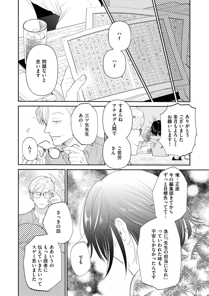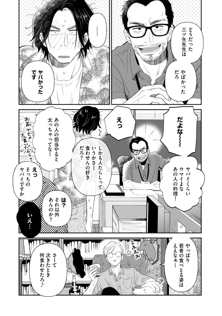 三ツ矢先生の計画的な餌付け。 三ツ矢先生の計画的な餌付け。 漫画 2025.10.2 すげーいい匂い。54歳の男性料理家にときめいて/三ツ矢先生の計画的な餌付け。(4) 若手編集者の石田友也。野球の経験を買われてスポーツ誌に配属されるが、異動で慣れない女性誌へ。そこで、ひょんなことから人気料理研究家「三ツ矢先生」の連載を担当することに――。 三ツ矢先生にすっかり胃袋をつかまれてしまった石田は……。 ■すべての話を見る ©松本あやか/ぶんか社 無断転載禁止 すべての話を見る ほかのまんがを読む 作品情報 『三ツ矢先生の計画的な餌付け。』漫画:松本あやか 詳細・ご購入はこちら※電子書籍版と紙版(描き下ろし有)で一部内容が異なります。 前の記事 料理は1日3回のおまじないみたいなもんでええねん/三ツ矢先生の計画的な餌付け。(3) 三ツ矢先生の計画的な餌付け。 次の記事 毎日機嫌よういられますように。料理ってそんなもの/三ツ矢先生の計画的な餌付け。(5) 記事をシェアする