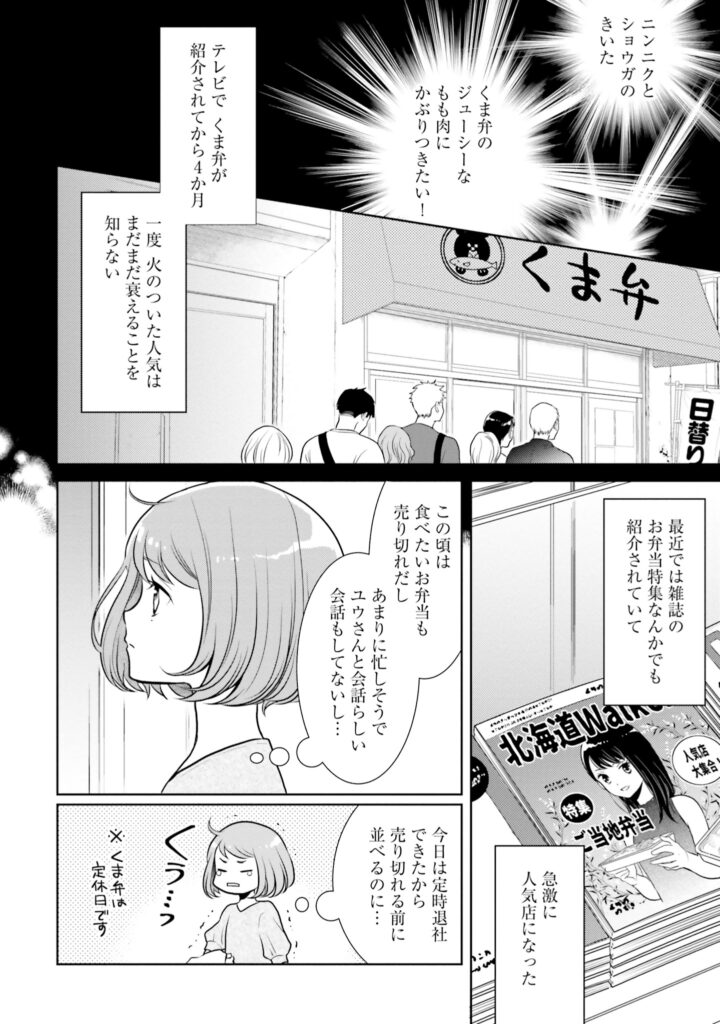 恋人に二股をかけられ、傷心状態のまま北海道・札幌市へ転勤したOLの千春。 仕事帰りに立ち寄った弁当屋「くま弁」でお弁当の作り手・ユウと出会う。ユウが作るお弁当は、口にするたびに千春の凍った心が解けていく……。