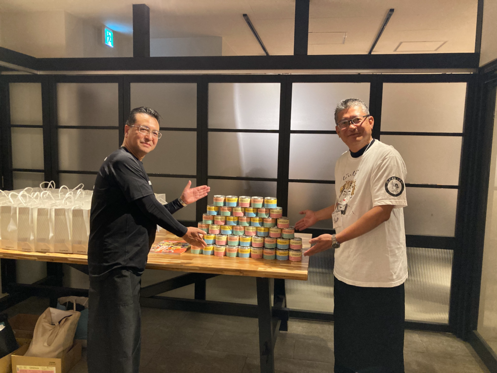ここで、参加者のみなさまにサプライズが。地元に愛される名店「海ごはん しまか」とツレヅレハナコさんの大ファンの、盛岡大宴会を盛り上げてくださった地元企業「岩手缶詰」の山下社長、伊藤工場長から、「ギフトにしたくなる災害備蓄にもなる缶詰」の魚介リゾット3種セットをお土産として参加者、スタッフへプレゼントしていただきました。