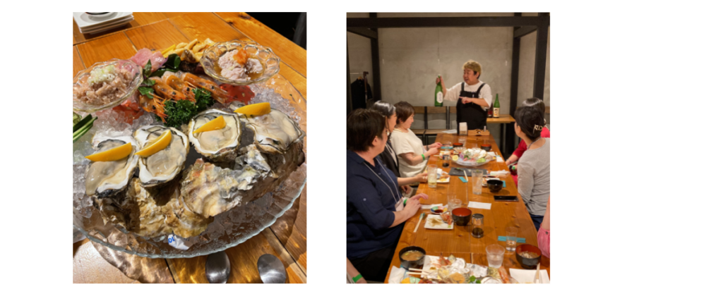 魚介はすべて三陸から直送という迫力の大皿刺し盛りから料理がスタート! ぷりぷりの殻付き生牡蠣、三陸でおなじみの魚「どんこ」の肝和え、酢醤油で食べる新鮮なホヤ、鱈白子ポン酢などなどこのツアーのための、スペシャルメニューが次から次へ。岩手の日本酒一升瓶も6本並び、しまかのマスターよりご紹介。大人気の「AKABU」や、「酔仙」が特約店だけに卸す「たてがみ」まで岩手の地酒を堪能しました。三陸の海の幸をつまみに、お酒もすすみすぎてしまった盛岡の夜。