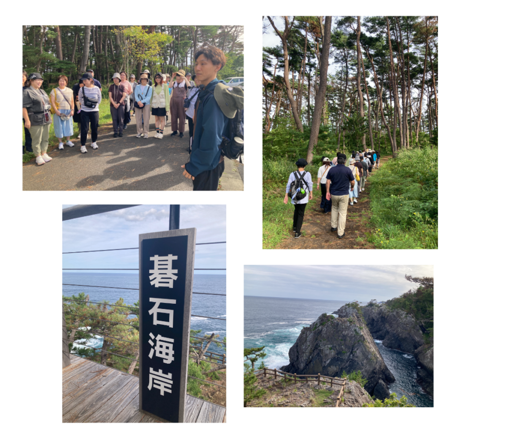 その後、三陸といえば〈リアス(式)海岸〉です! 大船渡が誇る絶景ロケーションの碁石海岸へ移動。八戸から南相馬まで、4県28市町村にまたがる太平洋沿岸を一本の道でつなぎ、三陸海岸の国立公園を通る、自然豊かな海岸のロングトレイル【みちのく潮風トレイル】を散策します。豊かな自然の中を歩くと、陸前高田などの海岸線も見え、自然と街、人の生活がつながっていることが実感できます。約1時間の自然散策で、お腹も空いてきて……夜の宴会の準備は万端に。