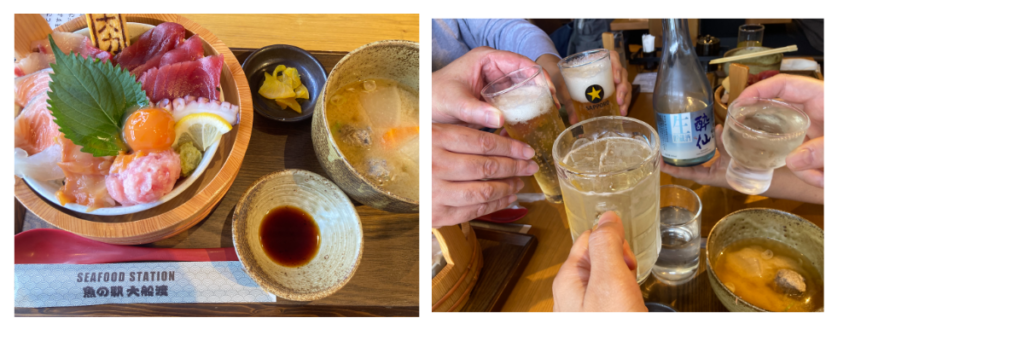 JR盛岡駅から大型バスで移動し2時間弱。大船渡の中心地・キャッセン大船渡に隣接する鮮魚店が運営がする「魚の駅 大船渡」で、卵黄の塩漬けがアクセントの海鮮丼ランチに。海の恵みに舌鼓をうちます。(もちろん乾杯する人も!)