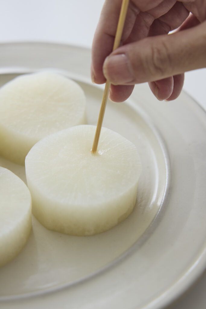 大根は煮る前に、竹串がすっと通るくらいになるまでレンチンするのがコツ。レンジ加熱することで、下ゆでするよりも大根に早くむらなく火が通り、煮込み時間を短縮できるだけでなく、味もしみ込みやすくなります。