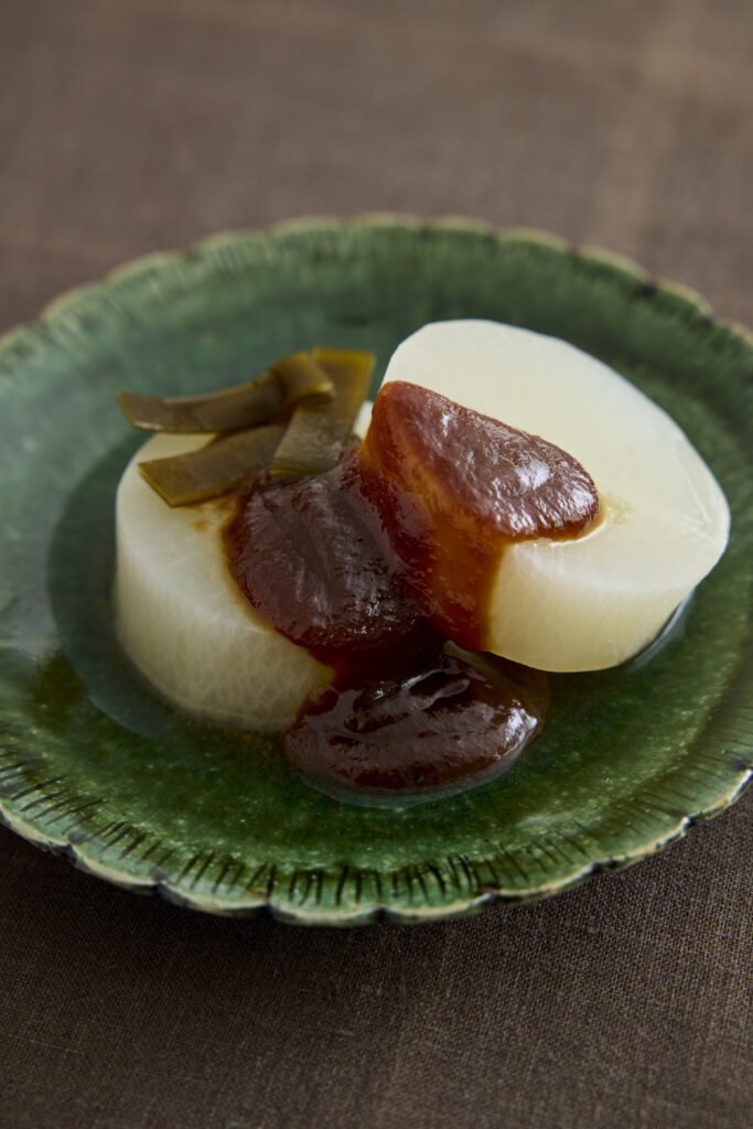 食べる直前にみそだれを作る。小鍋にみそだれの材料を入れて混ぜ合わせ、中火で熱する。煮立ったら、絶えず木べらなどで混ぜながら1分ほど煮つめる。(3)の大根を器に盛り、煮汁をかけて昆布をのせる。仕上げにみそだれをかける。