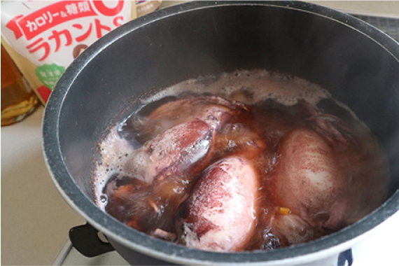 細かく刻んだにんじんとしいたけをもち米に混ぜていかに詰め、しょうゆ、みりん、酒、「ラカントS」顆粒で味つけした煮汁で炊くいかめし。3歳の息子も、これなら野菜を無理なく食べられます。
