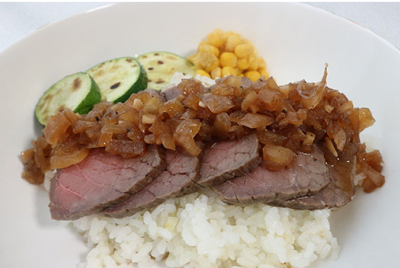 フライパンで焼きつけてから湯せんで加熱するローストビーフのたれは、玉ねぎ、にんにく、しょうがを炒め、「ラカントS」顆粒、しょうゆなどで味つけ。やさしい甘さで息子も大好きです。
