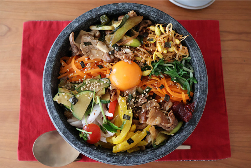 パプリカ、ズッキーニ、エリンギなど野菜たっぷりのビビンバ。肉の下味には「ラカントS」顆粒を使いましたが、1種類ずつ味つけする手間がかかるナムルにはシロップを使うことで手際よく作れました。