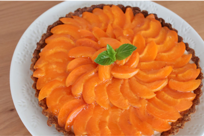 生のあんずをぜいたくに使ったアプリコットタルト。「ラカントS」でカロリーオフできるので安心して食べられます。タルト生地には顆粒を、カスタードクリームと仕上げのゼリー液にはシロップを使用。