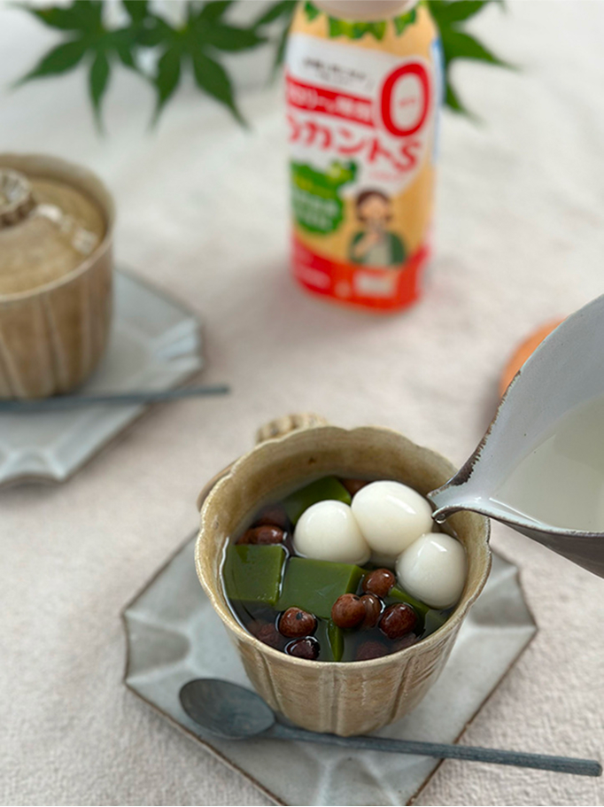 抹茶寒天の白玉みつ豆は、「ラカントS」をダブル使い。寒天と煮豆には顆粒を使い、シロップを水で割って黒みつ代わりにかけました。さっぱりした甘さで、全部飲み干せるほどおいしいと家族にも好評。
