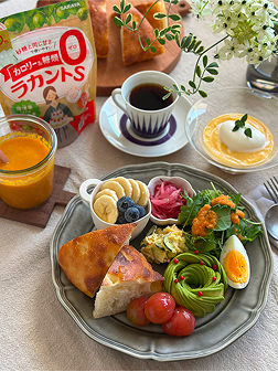 パンに合う作りおきのマリネなどを朝ごはんのワンプレートに。ドレッシングは、旬のにんじん、玉ねぎをフードプロセッサーにかけ、調味料と「ラカントS」顆粒を混ぜた手作り。