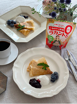 クレープパンで焼くクレープに、旬のブルーベリーで作ったジャムを添えて。どちらも「ラカントS」顆粒を使い、カロリーゼロの甘味料だと聞いて夫は驚いていました。