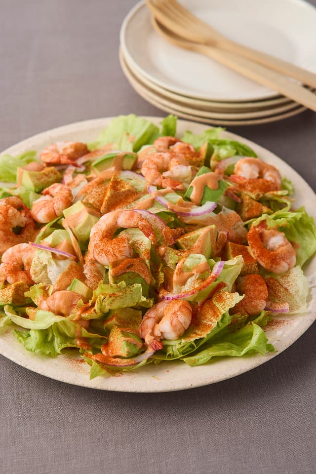 切って盛りつけ、ドレッシングをかけるだけで豪華サラダの完成! マイルドなのにほんのりスパイシーなチリパウダー入りドレッシングは、魚介やタコスチップとも相性抜群です。