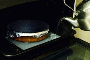 オーブンの天板に湯をはり、湯せん焼きでなめらかに焼き上げます。