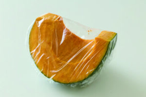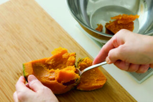 かぼちゃプリンを口当たりよくするためには、最初に、かぼちゃをしっかりと加熱し、柔らかくしてから使うことが肝心。個体差があるので、様子をみながら加熱して。
