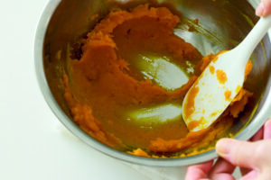 グラニュー糖を加え、ゴムべらでかぼちゃをつぶしながら混ぜて、ペースト状にする。