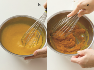 牛乳、生クリームを少しずつ加えながら、そのつど泡立て器で混ぜる(a)。かぼちゃのかたまりが残っていればつぶし、溶きのばしながら混ぜる。溶いた卵を加え、泡立て器で混ぜる(b・すが入りやすくなるので泡立てないように混ぜる)。