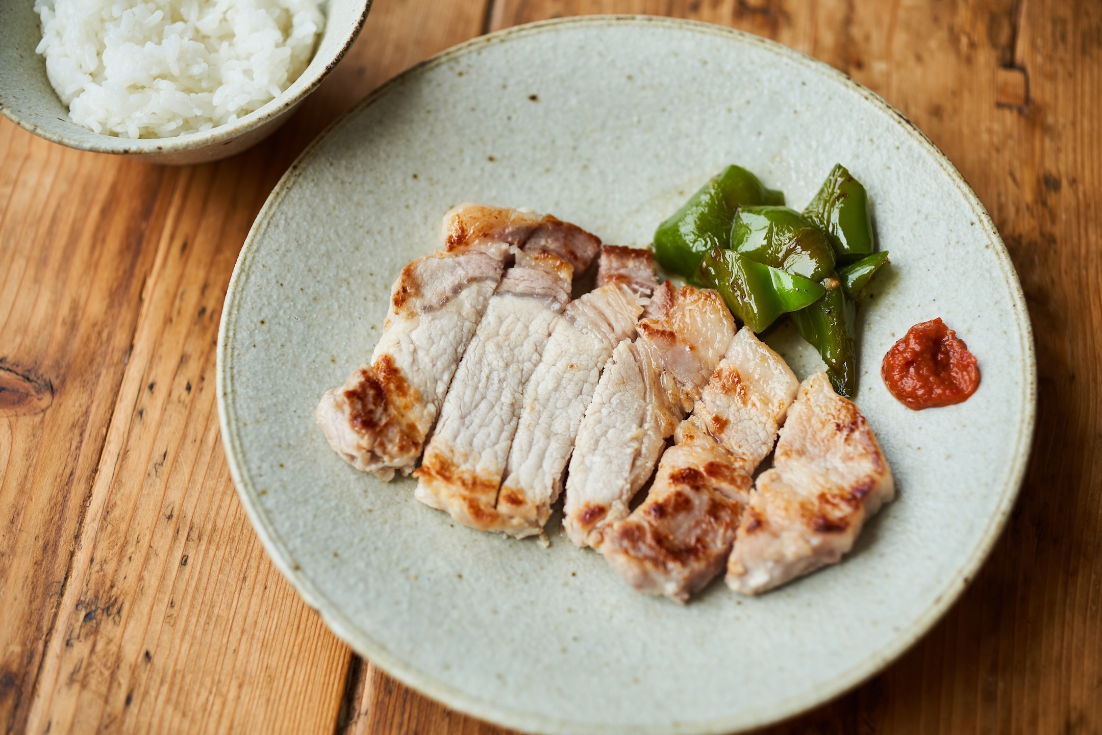 生かんずりは、豚肉との相性もよいので、特に焼いた豚肉に合わせるのがお気に入りです。今回は、塩麹でつけた豚肉につけてみました。
