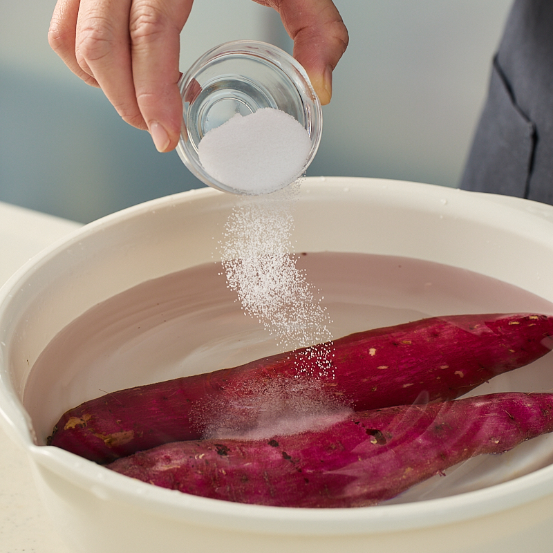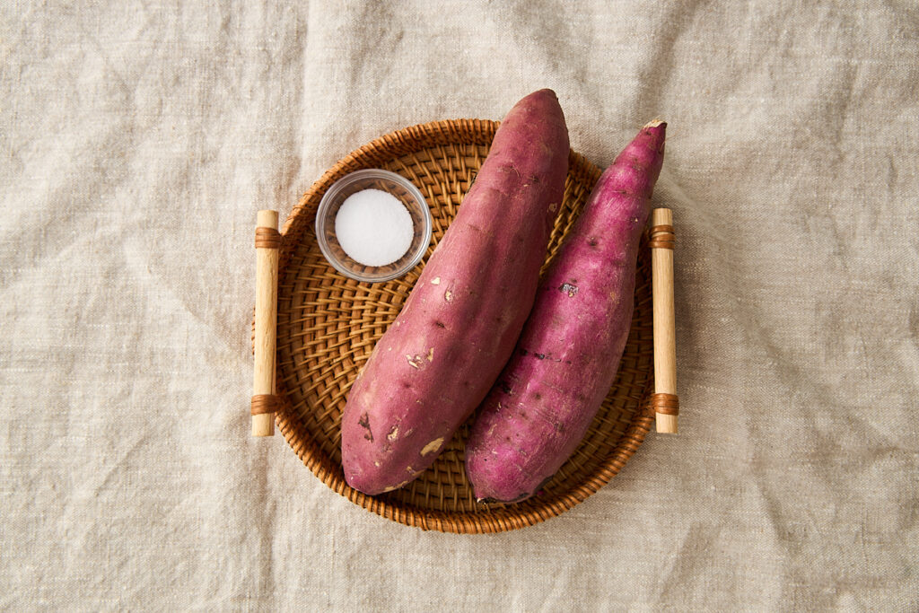 さつまいもが塩水を吸うので、すいかに塩をふると甘くなる理論と同じで、ほんのりとした塩けが甘さを際立たせてくれます。単調になってしまいがちな「甘さ」の中に、塩の持つしょっぱさとミネラル感が付与されることで味に深みが増しますよ。