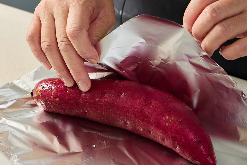 2.塩水漬けにしたさつまいもを、ぬれたままアルミホイルでぴったり包む。