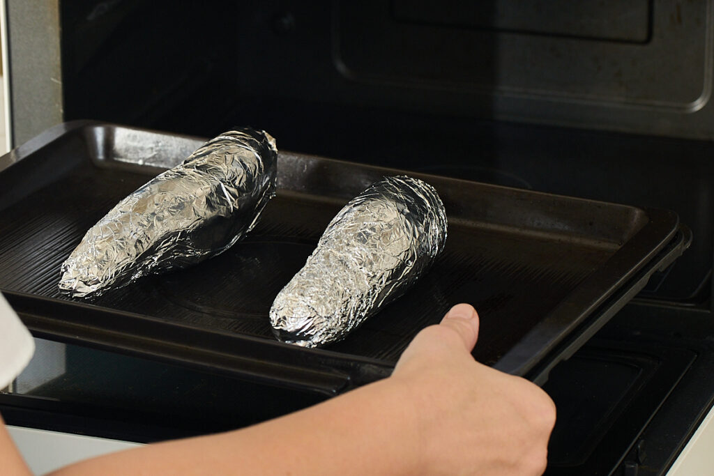 4.やけどに気をつけていったん取り出し、アルミホイルを開く。オーブンの温度を170℃に上げ、さらに15分加熱する。