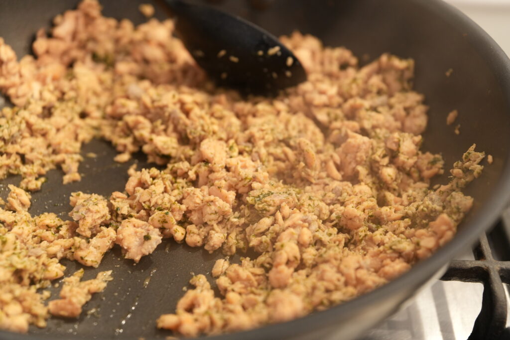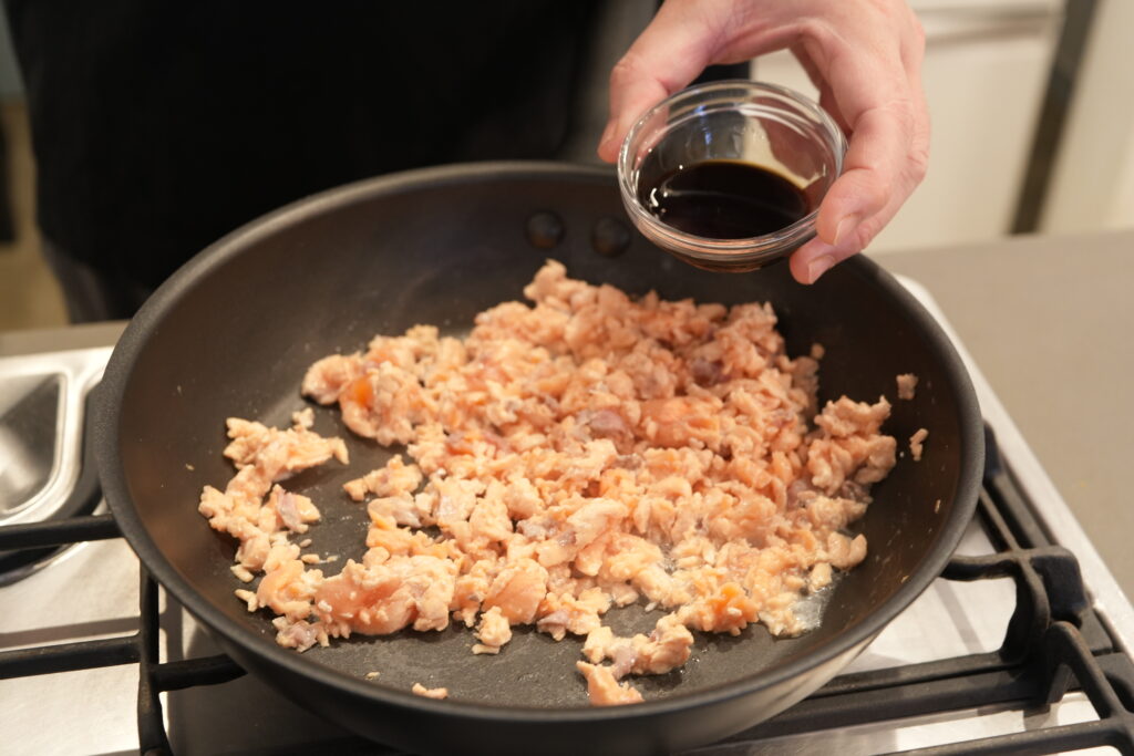 へらなどでほぐしながらひと煮立ちさせ、1〜2分煮る。色が変わってほぐれてきたらしょうゆを加える。