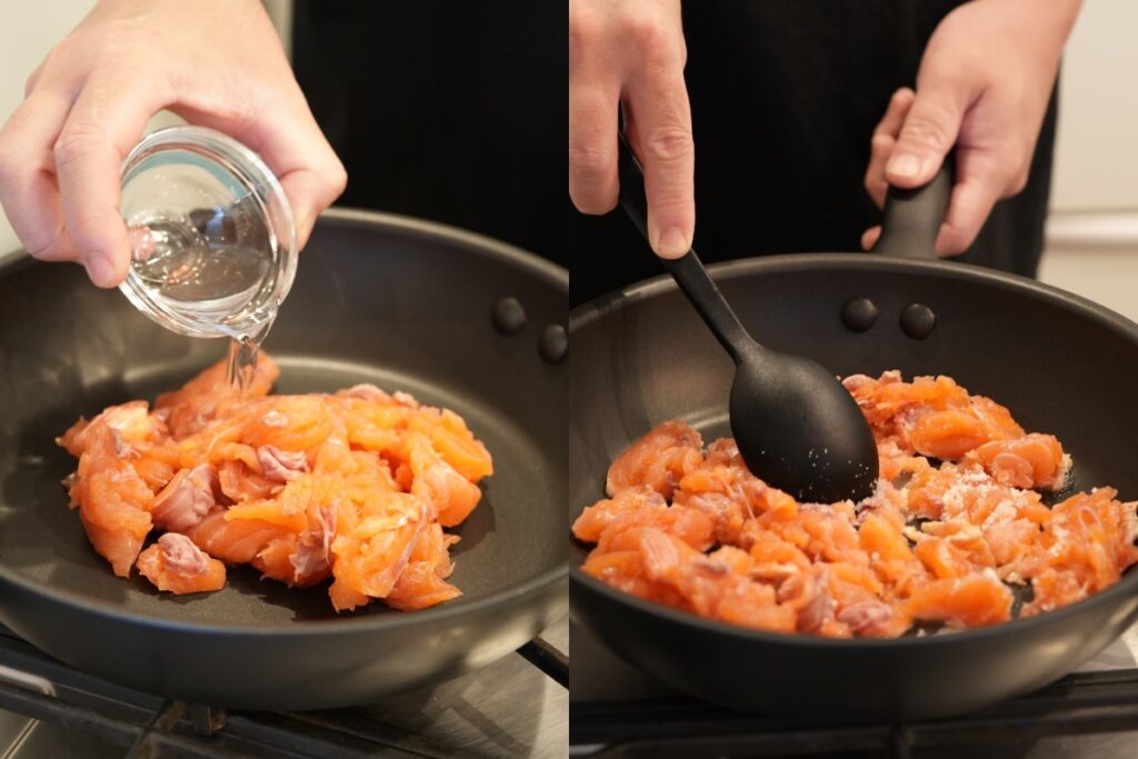 フライパンに鮭、酒、砂糖を入れて中火にかける。