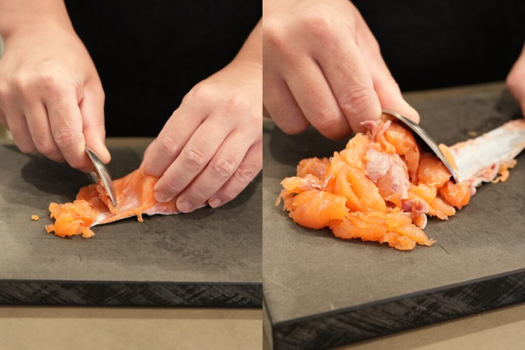鮭はスプーンで身をこそげ取り、皮と骨を取り除く。