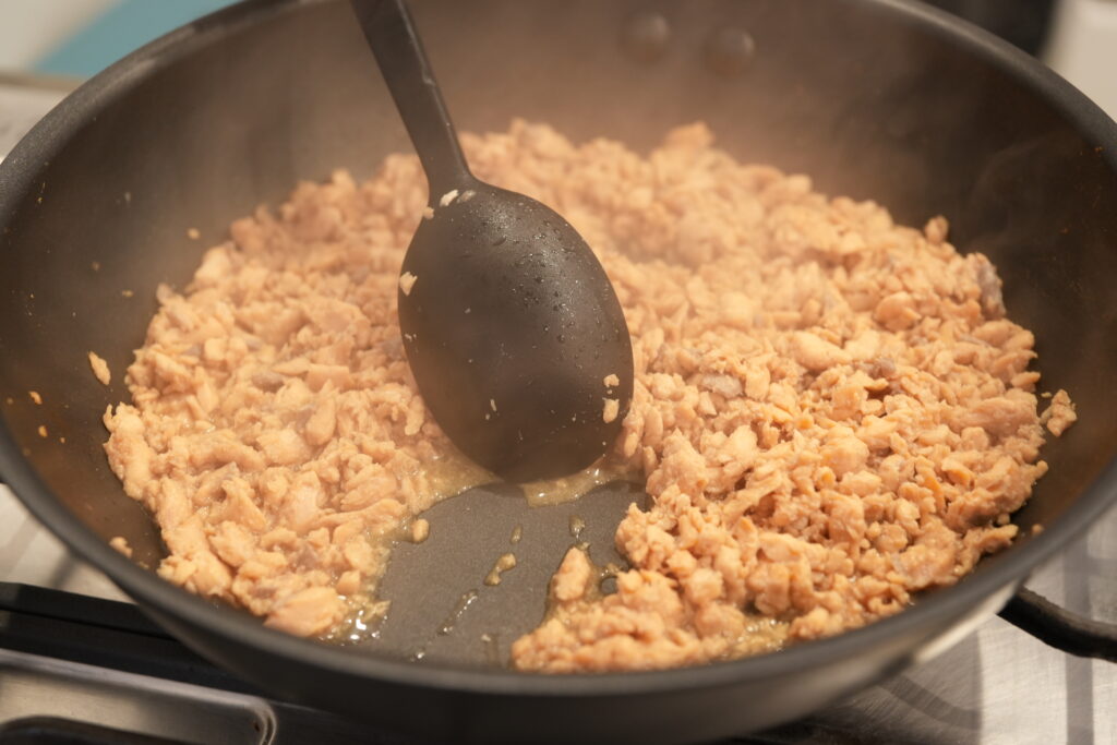 さらに混ぜながら鮭がぽろぽろになり、汁が少なくなるまで2〜3分煮る。