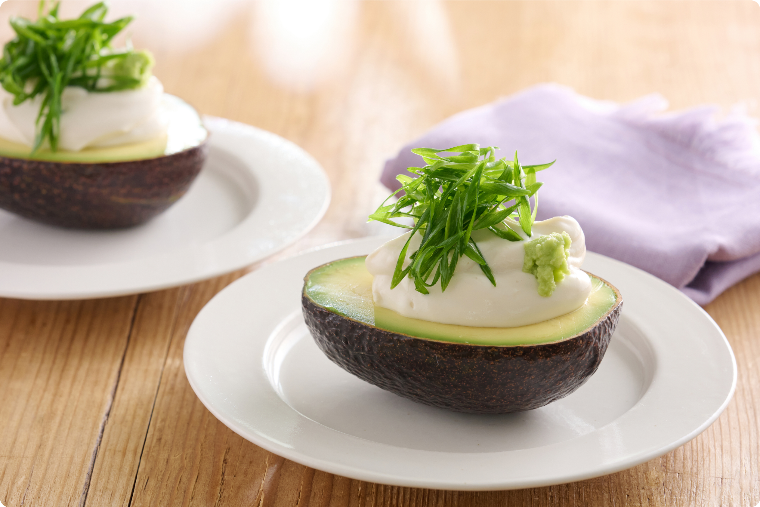 スプーンですくっていただく、アボカドサラダ。半分にカットしたアボカドに材料をのせていくだけで簡単に作れるのに、見た目もおしゃれでテンションアップ! 朝ごはんはもちろん、夜のお酒のお供にも◎。添えたわさびがいいアクセントに。