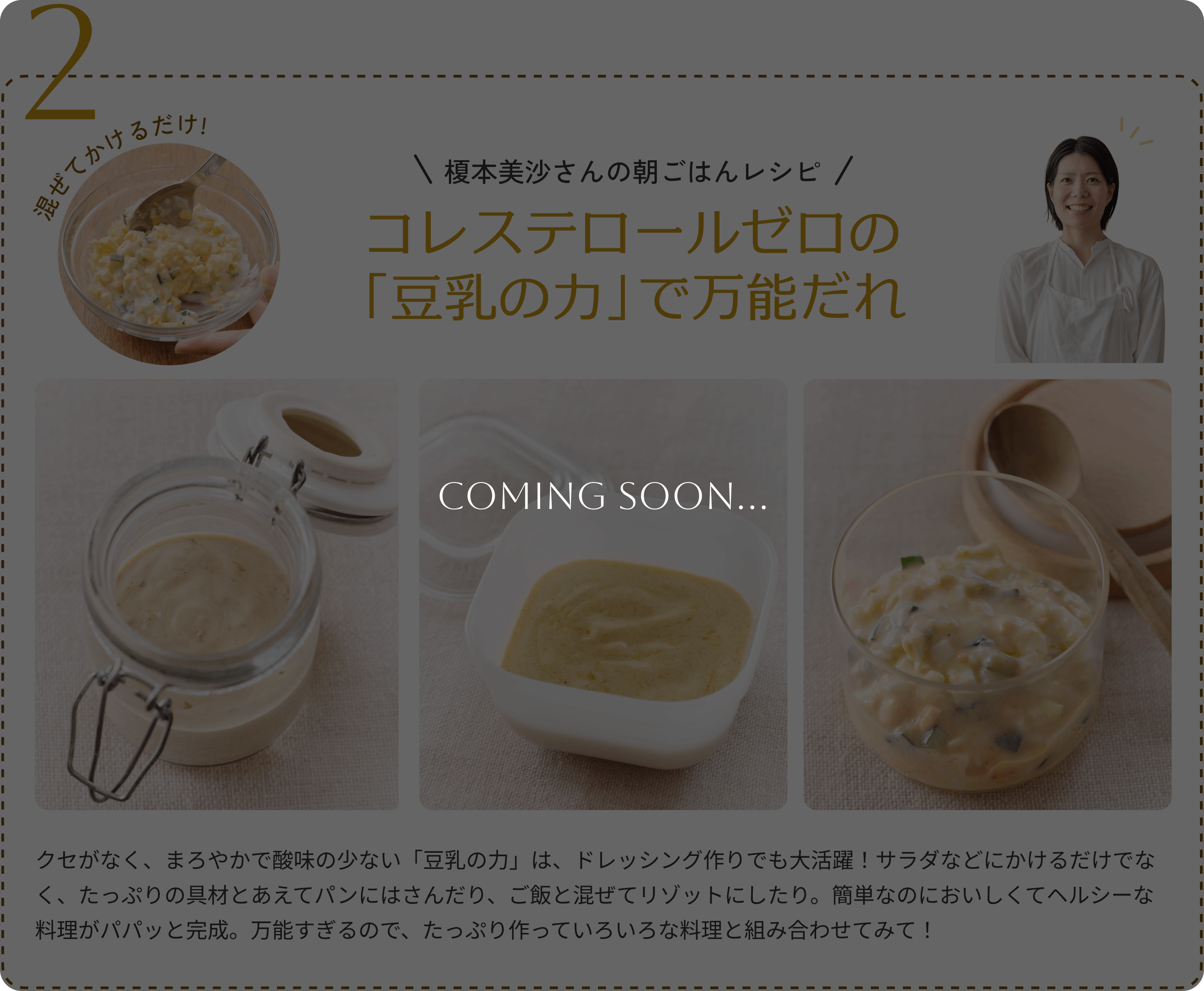 そこで今回は、「豆乳の力」を使った朝ごはんメニューをご紹介します。簡単に作れてまねしやすいのに、いつもの食卓がグッと豪華で栄養満点になること間違いなし!