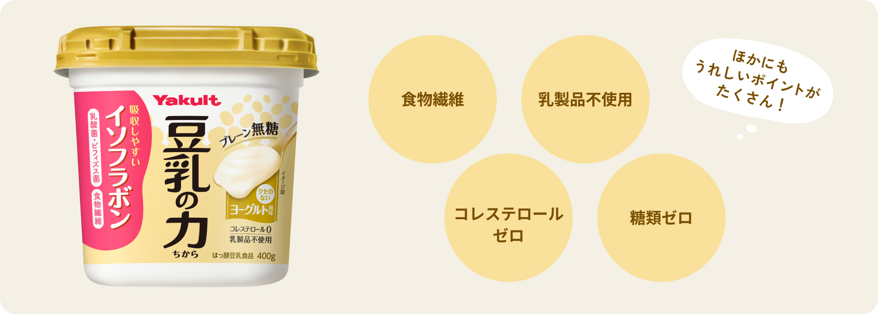 「豆乳の力」は豆乳を発酵させることで、体にとって吸収しやすいイソフラボンに。おいしくいただきながら効率的に栄養チャージできるなんてうれしいですね。食物繊維が含まれているのでおなかにもうれしいし、カロリーや脂質を抑えられるのもありがたい!
