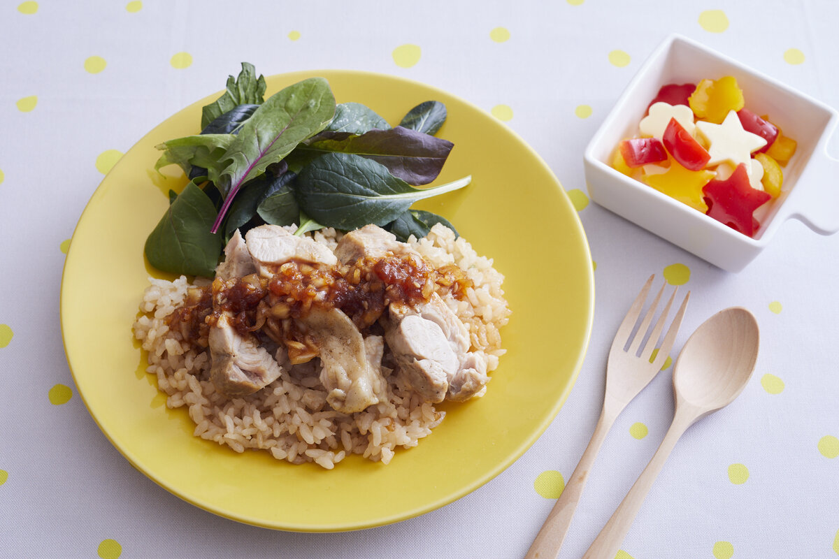 vol.3 肉も野菜もたっぷり食べちゃおう「シンガポールチキンライス黄金風&パプリカとチーズのカラフルサラダの献立」