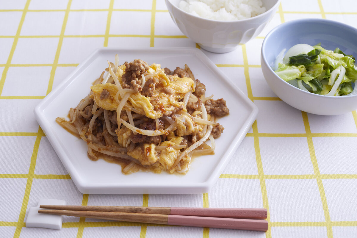 vol.2 肉も野菜もたっぷり食べちゃおう 「ふんわり卵とひき肉もやしの黄金炒め&キャベツと玉ねぎのコールスローの献立」