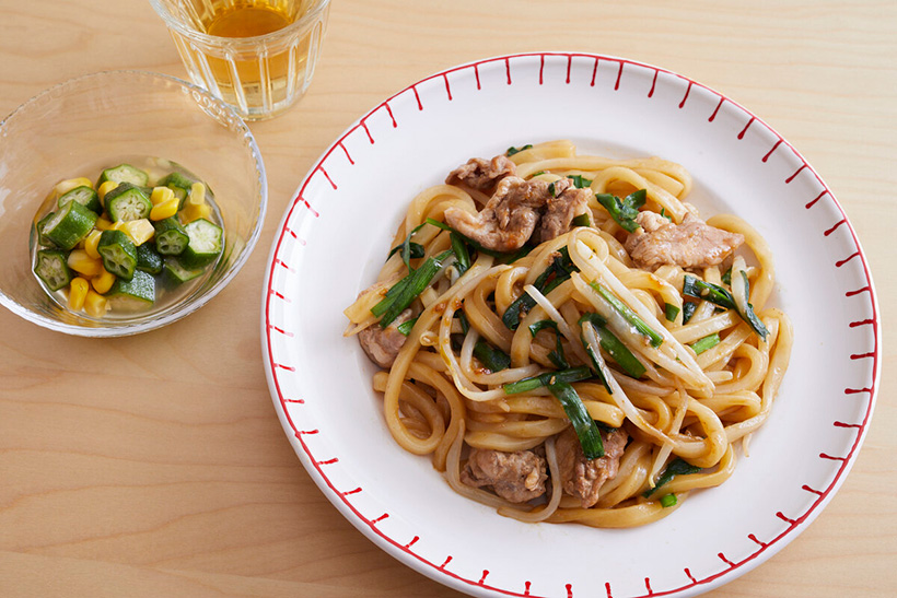 vol.4 肉も野菜もたっぷり食べちゃおう「豚にらもやしの黄金焼きうどん&オクラとコーンのゆず風味浅漬けの献立」