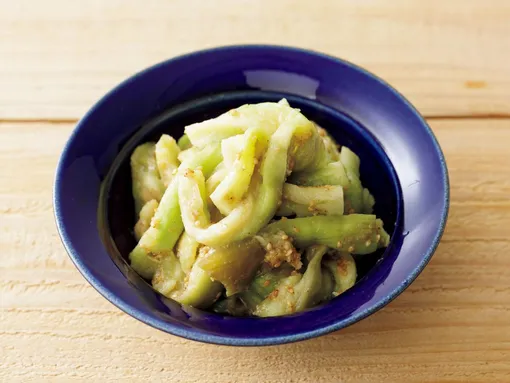 ボールに〈あえごろも〉の材料を混ぜる。蒸しなすを手で8等分に裂いて加え、全体をあえる。