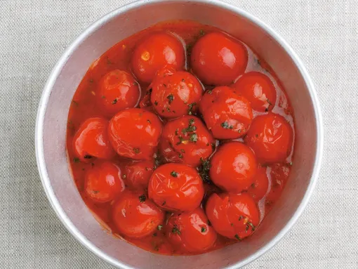 トマトは洗って水けを拭き、へたを包丁の刃先でくりぬく。密閉できる冷凍用保存袋に平らに入れ、空気を抜いて口を閉じる。バット(熱伝導がよいステンレス、またはアルミ製のものがおすすめ)にのせて冷凍庫に入れ、完全に凍ったらバットを取ってOK。