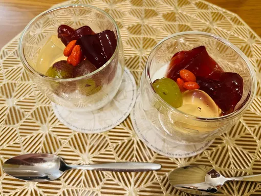 あればくこの実は湯にさっとくぐらせて柔らかくし、水けをきる。口径約10cmの耐熱のボールにAを入れて混ぜ、ふんわりとラップをかけて電子レンジ(600W)で1分ほど加熱する。さっと混ぜて砂糖を溶かし、粗熱が取れたらレモンを加えて香りをうつす。(3)に等分に注ぎ、くこの実をのせる。