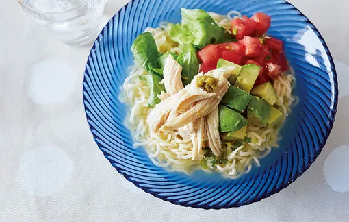 そこで市販のインスタントラーメンを使った、この時期に食べたい「冷やしラーメン」をご紹介。アボカドとトマト、サラダ菜に、サラダチキンものせて、食べ応え満点。あっさり塩味&ゆずこしょうのさわやかな風味が夏にぴったりです。
