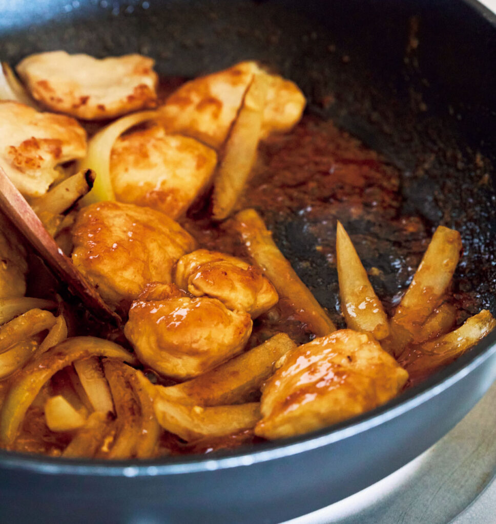 玉ねぎは幅1cmのくし形に切る。鶏肉は皮を除き、幅1cmほどの大きめの一口大のそぎ切りにして片栗粉をまぶす。