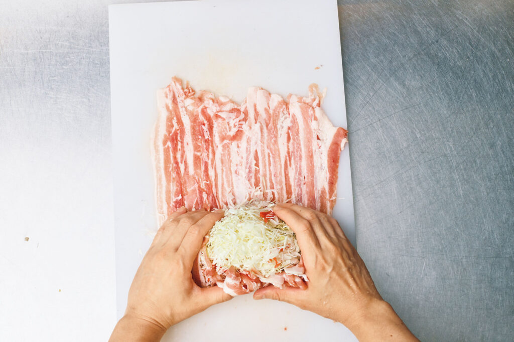 キャベツはせん切りにし、紅しょうがとざっと混ぜる。まな板に豚肉を幅約25cmくらいになるよう少しずつ重ねながら、縦長に並べる。