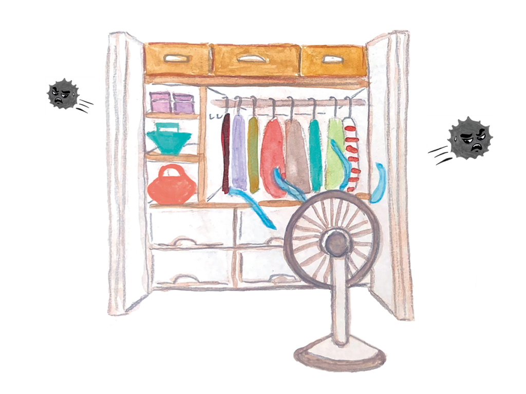 扉を開けて、サーキュレーターや扇風機で風を送って換気するのがいちばんのカビ対策。クローゼットの大きさにもよりますが、晴れて空気が比較的乾燥しているタイミングに、2~4時間程度換気しましょう。