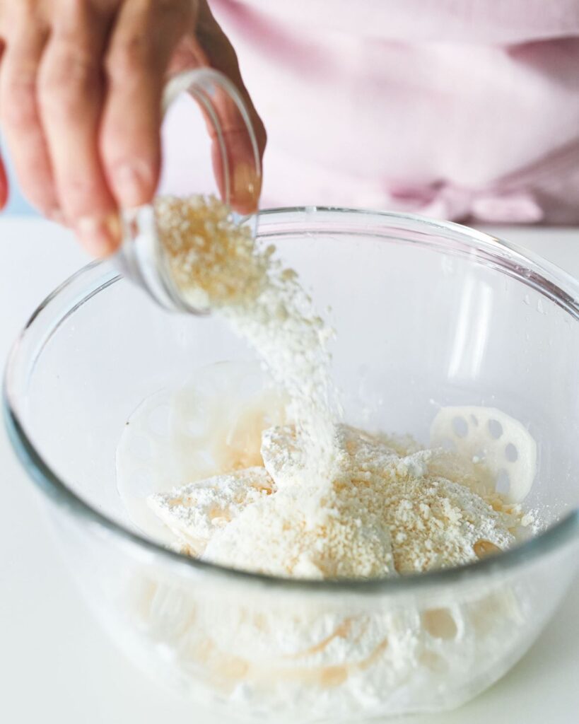れんこんは皮をむき、あればスライサーで薄い輪切りにする。ボールに入れ、水大さじ2をまぶす。粉チーズ、小麦粉、塩、こしょうを加え、全体を混ぜる(粉っぽければ、水大さじ1/2~1をたす)。