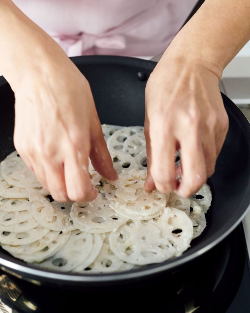 フライパンにサラダ油を広げ、れんこんを並べる(外側から内側に向かって1 枚ずつぐるりと並べるときれいに仕上がる)。弱火にかけ、10分ほど焼く。