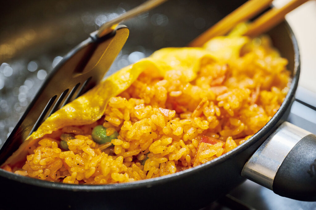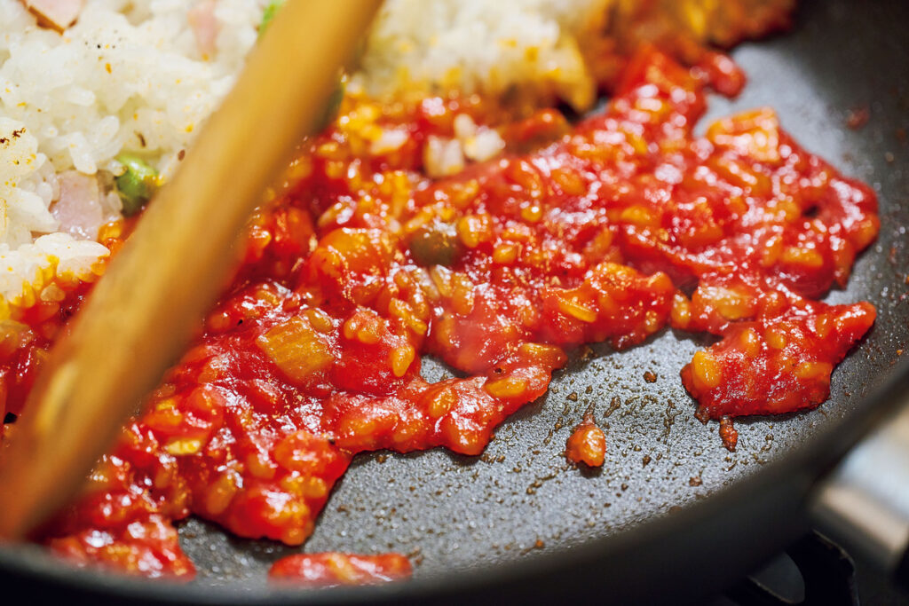 炒めるようにして水分をとばしながら、2/3量程度になるまで1分ほど焼く。酒を加え、ご飯となじむように全体を炒め合わせて、火を止める。