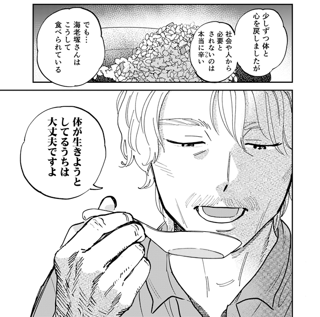 妻に出ていかれた元刑事の海老塚は、かつて面倒をみた前科者の蟹原と暮らすことに。家事が得意な蟹原から、肉じゃがやチャーハンなどさまざまな料理を習います。おだやかな蟹原の「料理はやり直しがきく」という言葉が心にしみます。