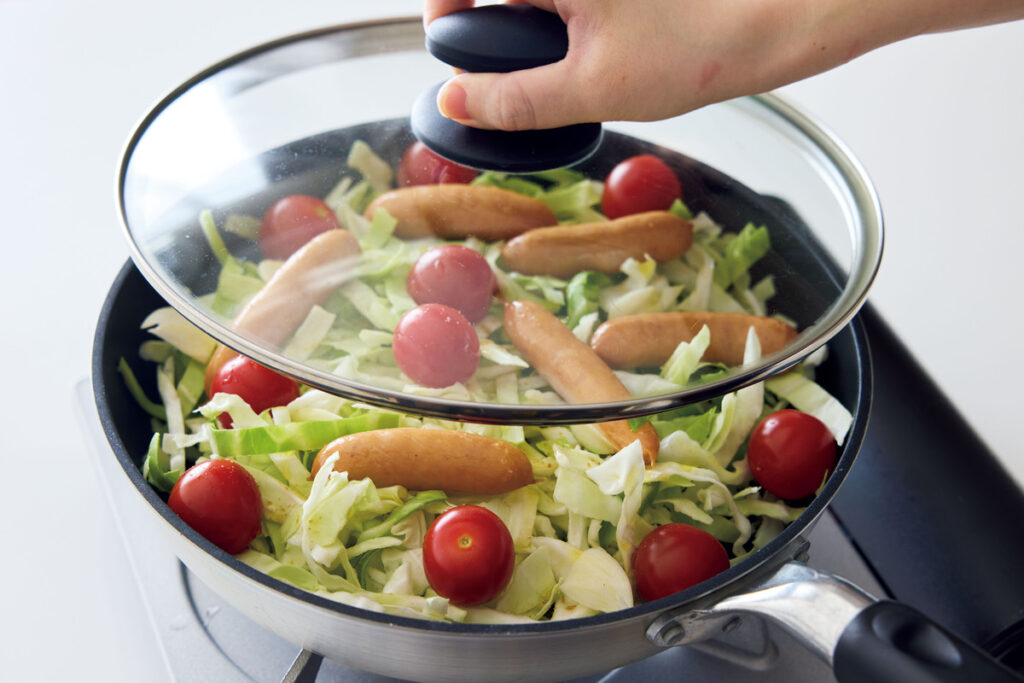 フライパンにキャベツを広げ入れ、ソーセージをのせる。にんにく、ミニトマトを散らし、〈A〉を加える。ふたをして中火で熱し、湯気が出てきたら弱めの中火で15分ほど蒸し煮にする。器に盛り、粗びき黒こしょうをふる。