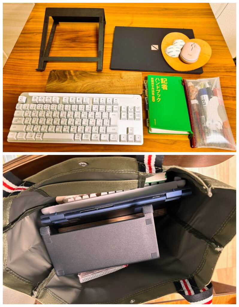 ノートPCやキーボード、マウス、PCスタンド、書籍までしっかり収納できる大容量ぶりに大満足。最後にフランスパンを横向きに入れられたのだとか!